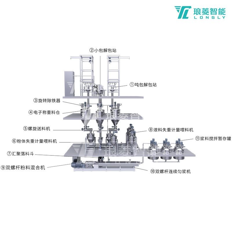 ①吨包解包站 ②小包解包站 ③旋转除铁器 ④电子称重料仓 ⑤螺旋送料机 ⑥粉体失重计量喂料机 ⑦汇聚落料斗 ⑧液料失重计量喂料机 ⑨双螺杆粉料混合机 ⑩双螺杆连续匀浆机 ⑪浆料搅拌暂存罐