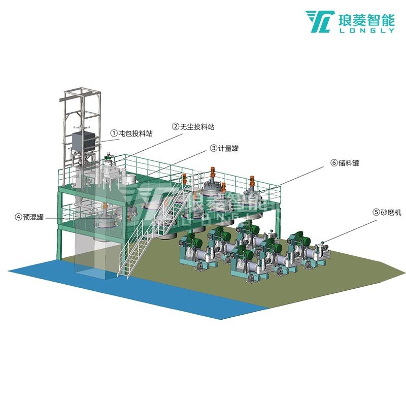 ①吨包投料站 ②无尘投料站 ③计量罐 ④预混罐 ⑤砂磨机 ⑥储料罐