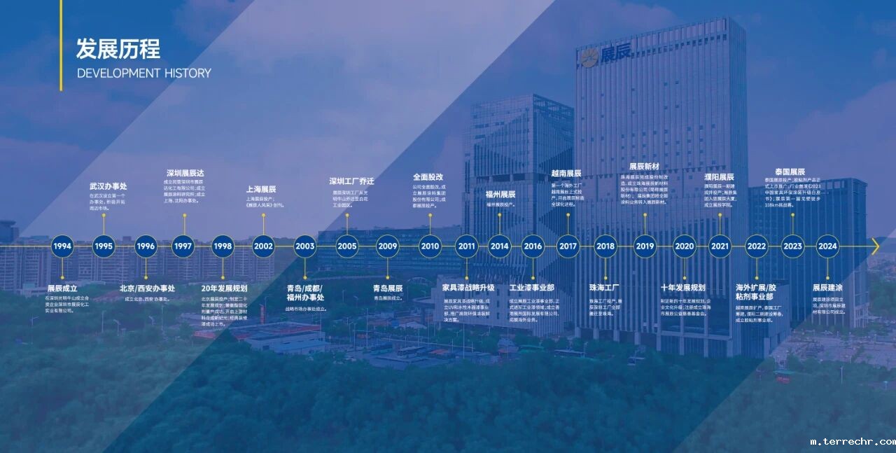 展辰新材料集團股份有限公司成立于1994年,總部位于深圳,是壹家集環保塗料研發、生産、銷售和工程施工爲壹體的國家級高新技術企業。公司主營木器塗料、工業塗料、建築塗料及膠粘劑,産品廣泛應用于家具、建築、工業等領域。經過多年發展,展辰新材在全球擁有九大生産基地,是中國塗料行業頗具規模的民族企業。